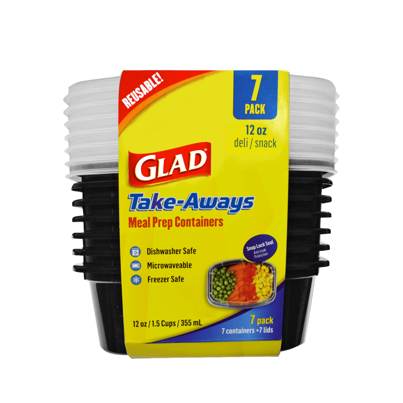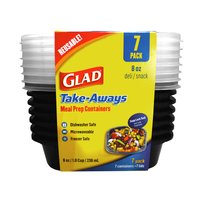 Glad Take-Aways’ 24oz round food storage container is the ideal medium size for soups, salads, and meal prep. Made from BPA-free, FDA-compliant materials, it supports safe and reliable food storage. Snap-Seal technology ensures a leak-resistant seal to help keep food fresh. Stackable and space-saving, this container is microwave, freezer, and dishwasher safe for everyday convenience. Available in black and sold in a set of 7. Sustainable options available.