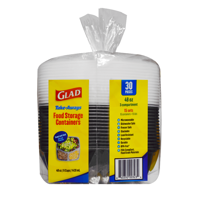 Meal prep like a pro. This 3-compartment container keeps your mains, sides, and sauces in perfect harmony. Glad Take-Aways’ 48oz 3-compartment food container helps streamline prep and portioning with separate sections for each part of your meal. Featuring a leak-resistant Snap-Seal lid and durable, BPA-free construction, it’s safe for microwave, freezer, and dishwasher use. Great for planning ahead and packing balanced meals. Available in a convenient 15-pack bag for everyday use and easy storage. Sustainable options available.